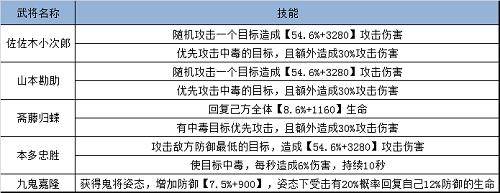 日本阵营的五个紫色武将是:佐佐木小次郎、本多忠胜、山本勘助、斋藤归蝶和九鬼嘉隆。下表中是这五个武将的技能: