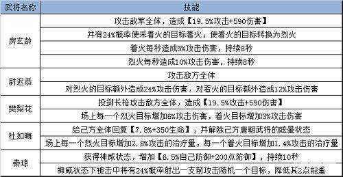 作为群攻阵营,唐朝与荷马都有Buff叠加伤害增加的倾向,但在技能设计上又大相径庭。下表是唐朝紫星武将阵容及其技能。
