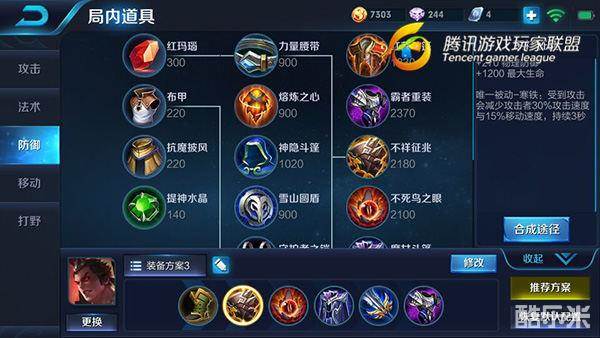 分析:本套出装采用了五件防御装搭配一件输出装的组合,力求将吕布的生存能力最大化的同时,又可以打出不俗的伤害。第一件装备推荐出影忍之足,此装备既让吕布十分灵活,又可以提高他前期应对敌方物理英雄的能力。第二件装备我们推荐出不祥征兆,此装备不仅可以提高吕布的物理防御和最大生命属性,而且寒铁被动又可以限制攻击者的攻速和移速,避免吕布被敌人放风筝。