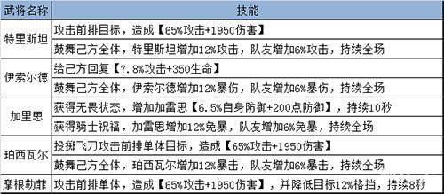 三个输出的目标一致,都指向敌方前排单体。特里斯坦鼓舞技能增加自身和队友攻击,珀西瓦尔鼓舞技能增加自身和队友暴击,伊索尔德鼓舞技能增加自身和队友暴伤。三人的BUFF加起来,使圆桌的攻击颇为不俗。最可怕的是攻击、暴击和暴伤三个BUFF都是持续全场,没有时间限制哦!