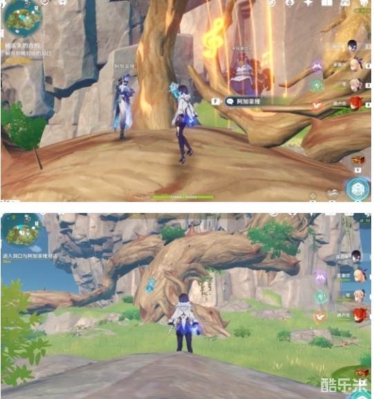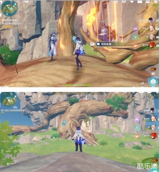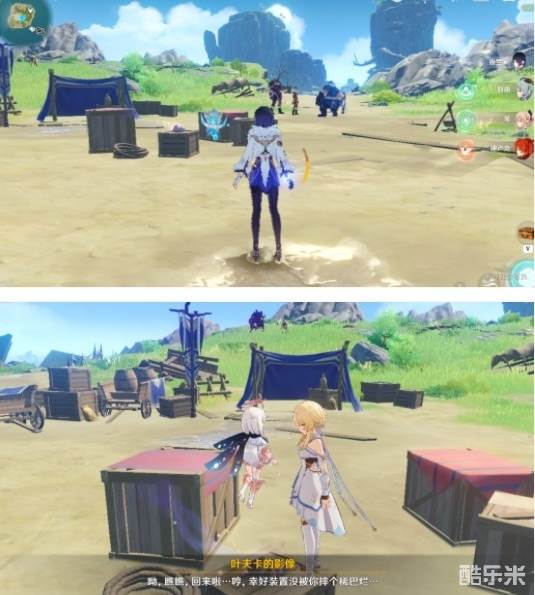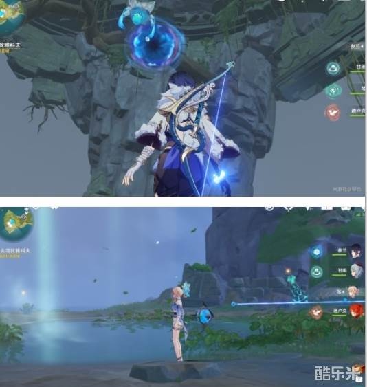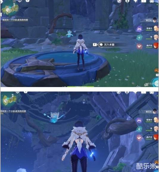 这里回声海螺提示了我们四个属性碑的顺序,白绿红蓝,即冰风火水,然后就能打开一个通道,再击打一次风属性碑,即可产生风场飞上去穿过通道,到达我们自己的营地。