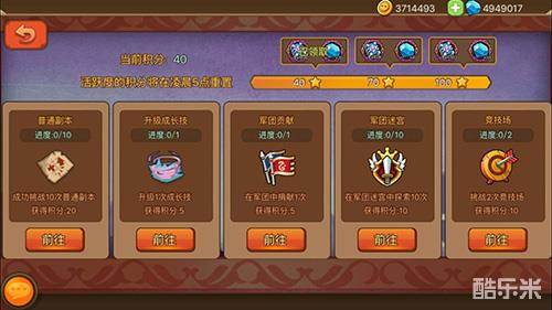 打开“活跃度”界面可以查看人物每日可以完成的任务。每完成其中一个任务可以获得一定的活跃度积分。积分达到40、70和100时各可以领取一个活跃度礼包奖励,奖励中包含大量经验。活跃度任务虽然只能领取三次奖励,但角色经验很多,每天都要检查直到全部完成哦。
