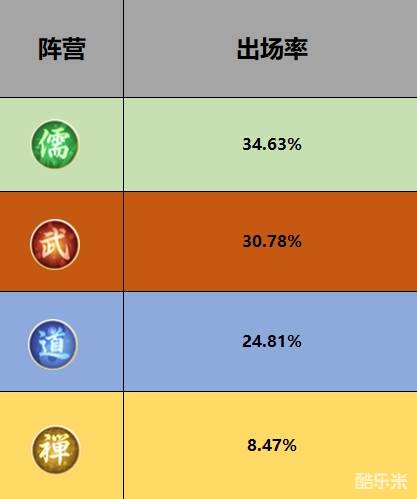 可以看到儒家阵营以高出场率霸榜,王阳明+司马迁的无解输出、越奶越强的芸珠、万金油辅助孟子,低门槛高强度的儒家是无疑仙友们培养仙灵的第一选择。武者、道庭阵营中也不乏强度高的仙灵,白起、萧擒龙都是前期伤害高的单卡,较易获取的道庭叠毒buff阵容培养成型后也有不俗的伤害。而禅宗阵营却以一个较低的出场率排在末尾,究其原因是当前版本的强势仙灵中禅宗仙灵实在不多,无论是PVP还是PVE的表现都不太尽如人意,所以鲜有玩家选择培养。