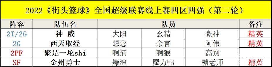 晋级四强的队伍中啊炳曾参加2021年《街头篮球》职业联赛新秀赛顶级荣耀新秀组的比赛,高别获得过2021年SFSA长沙八强,啊猴最佳战绩为2021年SFSA成都16强,是一支非常具有冲击力的战队。想念、余言、阿伟是3位个人实力出众的选手,都曾取得过不俗的战绩,特别是余言加入后,队伍的整体实力有了明显的提升,战斗力爆棚,不容小觑。
