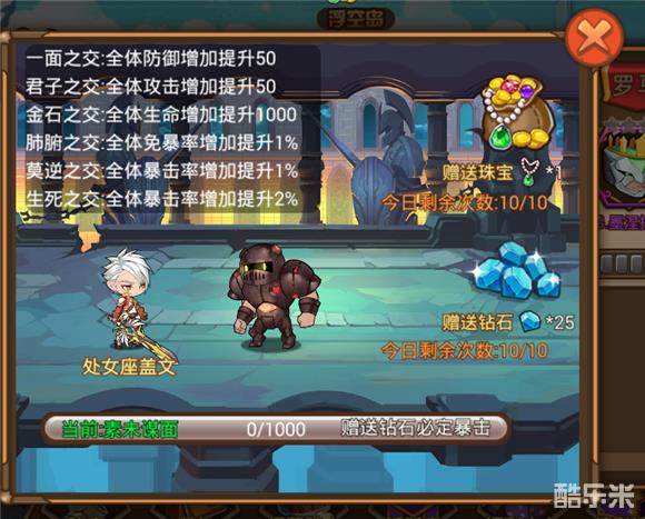 骑士好感度是对领主已有的紫色骑士进行互动,通过赠送珠宝和钻石,提高骑士的好感度,好感度达到一定阶段后,会提高所有骑士的属性。和领主培养一样,,赠送珠宝时有概率暴击获得额外经验,钻石赠送必定暴击。