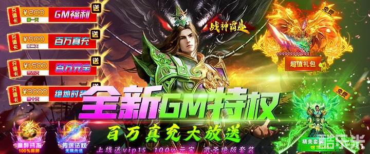 经典传奇,回味无穷!上线送vip15、100w元宝,绝版特效动态武圣时装!一次充值终生返利无限真充!GM八大特权豪华福利大放送!每日真充卡无限领取,GM特权商店全部1元宝购买,策划跳楼大甩卖!BOSS无限爆百万真充,全网最强福利传奇华丽来袭!邀你来战!