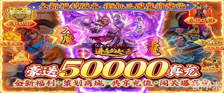 最后编辑于3年前经典回忆,全新版本新福利《进击的赵云(送五万真充)》震撼来袭,上线即送满级VIP,海量道具,升级豪送五万真充,闯关掉落真充,无门槛使用,除此之外还有全新无门槛策划宝库,桃园结义共享充值,还有更多福利等您来体验!