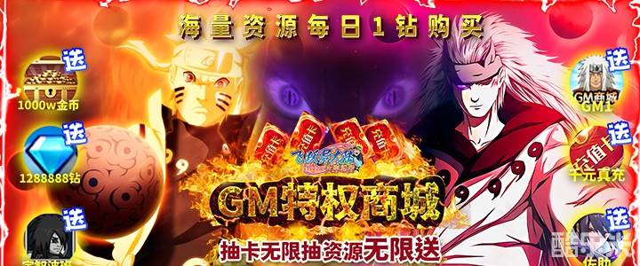 3.充值比例1:5000,首充即送超强忍者佩恩,续充首充礼包还有轮回眼佐助、大量道具。