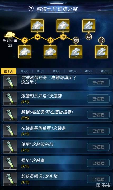 相信每一位出色的宇宙游侠都曾是个菜鸟,官方为各位萌新船长准备了一场试炼之旅!试炼之旅历时7天,每天发放7个任务,完成任务可获得包含军需补给证明、传说装备在内的丰厚奖励!期待各位萌新船长通过这场试炼,快速成长为战力爆表的宇宙游侠!
