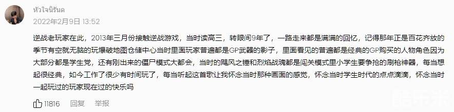 在“这战场千百热血战士,一路向前飞驰,捍卫世界的勇士,Fighting 再一决”的歌声中,众多玩家或许会想起曾经跟寝室兄弟们一起战斗的场景。而在QQ音乐《逆战》这首歌的留言区,2022年依然有玩家留言:自己记得曾经的逆战,以及逆流而战的精神。