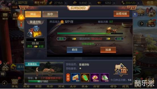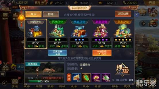 每天有1次免费提升品质的机会,每次提升品质有几率使货物的品质变高,但也有可能不变,花费少量元宝可以一键提升至最高品质,每日有4次押运次数,可购买额外押运次数。