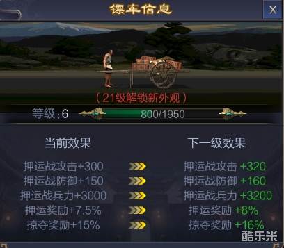 押运获得的镖车经验可以提升镖车等级,镖车升级可以增加属性和奖励,达到指定等级可以解锁新外观。