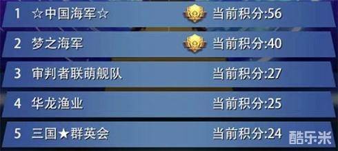 在过去的7场周常规赛的激烈角逐中,中国海军舰队凭借着经验与技术,以56积分位列积分榜榜首,梦之海军、审判者联萌、华龙渔业、三国群英会紧随其后位列前五,夏季排位赛将于8月27日进行,开启更加残酷、激烈,也更加考验战术与技术的强强对决。