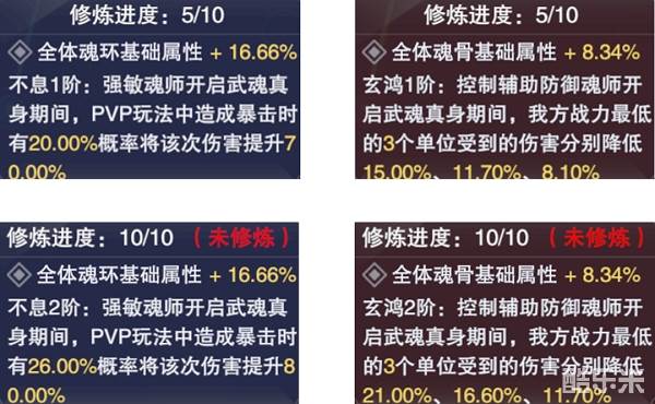 6.其次在修魂和炼体的选择上,考虑到目前在PVP玩法中开启强攻系、敏攻系魂师武魂真身的可能性并不大,因此我们可以选择炼体优先,修魂次之的策略,这样也能让我们的整体作战效果最大化。