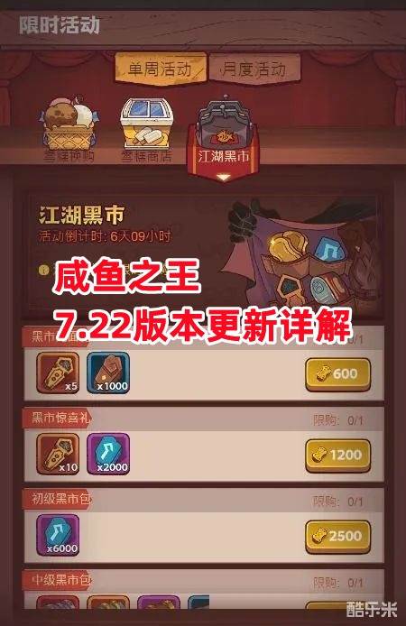 嗨喽大家好,我是小鱼。今天发布了新版本,让我们一起来看看更新了哪些内容吧。更新内容如下:周常活动「江湖黑市」开启【7月22日12:00-7月28日2359】黑市中有大量稀有道具出售,全部道具都可使用金砖进行兑换,快去购买你的资源吧!