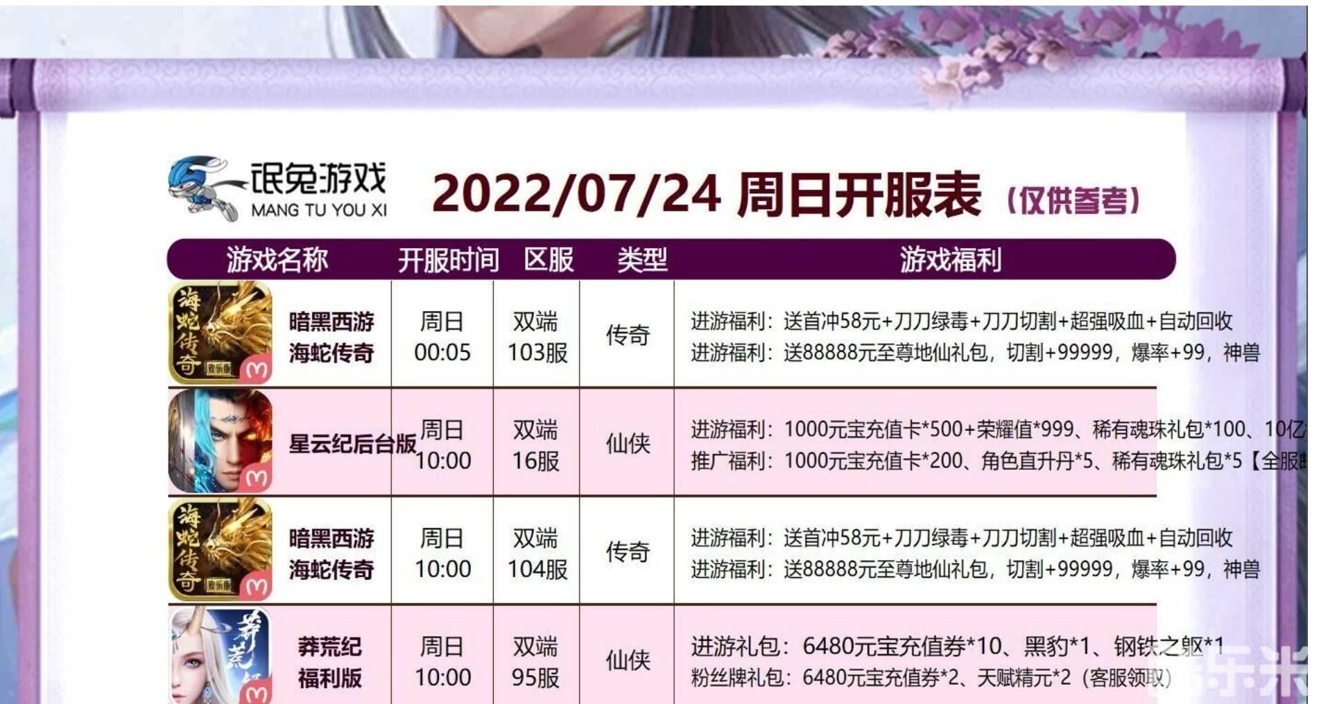 | 莽荒纪-福利版 | 95区( 苹果- 安卓) | 2022-07-24 10:00:00 |
