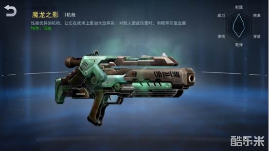 接着是SR品质的枪械,第一个是魔龙之影,拥有子弹命中敌人概率回复生命的特性,再加上自身稳定的输出能力可以在PVP以及PVE中稳定发挥。