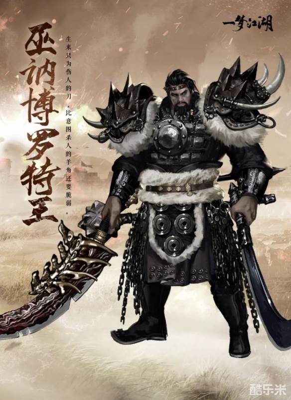 作为北蛮最出色的将军,巫讷博罗特王强壮勇猛、武艺超群,大开大合、霸气凌厉的刀法承自他在民风粗犷彪悍的北蛮闯下立足之地的先祖,威力无双、横扫千军。从头覆盖到脚的护具也显示出了巫讷博罗特王粗犷性格中的谨慎一面,他身披毛皮与铁甲缝制而成的坚硬战甲,胸口的护心铜镜闪过锐利的寒芒。他手持两柄精心打造的弯刀,刀刃锋利坚硬、削铁如泥,不容小觑!所以建议少侠与同伴直面巫讷博罗特王时,与队伍中的高气血同伴保持相互配合,避免其他队友遭到他的双刀处决。