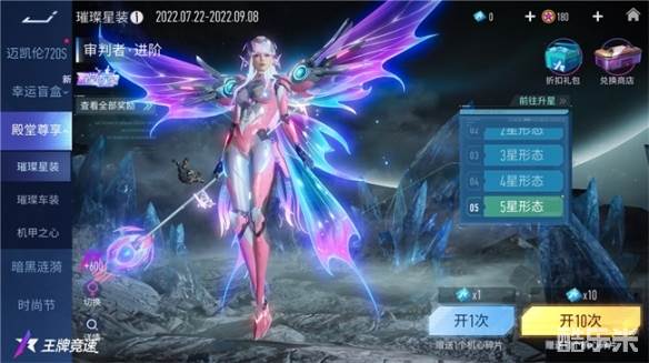 车手们获取审判者或制裁者时装的全部配件后,全新系统-星艺工坊将自动开启,使用极光币就可以对时装进行升星操作,每一次升星都将带来外观变化,如升至2星可获得紫电萦绕或梦幻流苏特效,3星时裁决之冠或审判之冠升级,4星和5星则将大幅增加翅膀的数量和形状,华丽程度将得到显著的提升,真正蜕变为璀璨星装,成为赛场上最耀眼的星辰!