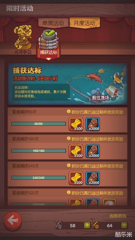 咸神争霸、捕获达标都是必做的,高级捕获没有160个鱼竿就不用做,囤着。4、每日咸王考验