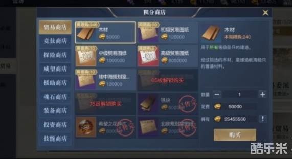 贸易商店:以贸易币为主要货币的商店,可以在此购买造船材料、命运石碎片、贸易船舱图纸等。贸易币可以通过贸易系统获得。