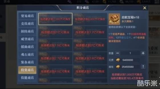 投资商店:以贸易币为主要货币的商店,该商店以礼包为主,内含贸易声望函、SS级造船材料、贸易船舱图纸、爵位证书等。在港口投资达到一定贸易币后即可解锁礼包的购买权。