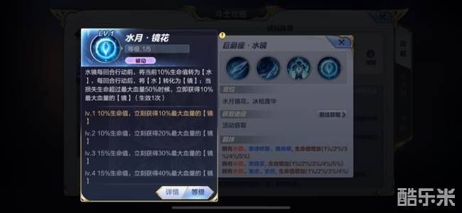水镜每回合行动前,当前20%生命值转为【水】,每回合行动后,将【水】转换为镜,当损失生命超过最大血量50%时候,立即获得50%最大血量的【镜】(生效1次)
