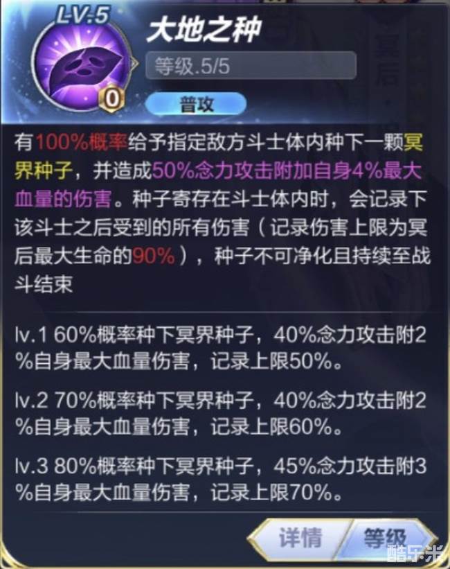 满级后,每个大回合结束时,敌方所有斗士的最大生命上限将流失10%并转化为冥后的生命上限,单个斗士生命流逝总额不超过冥后初始血量的40%,流逝的生命不会因为复活、剥夺追回