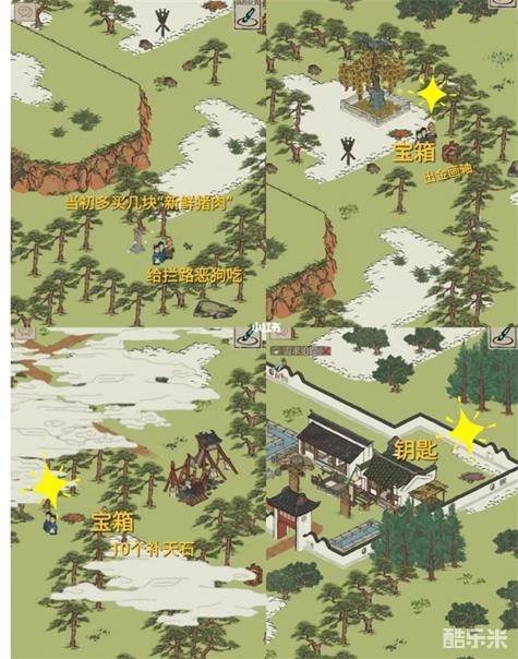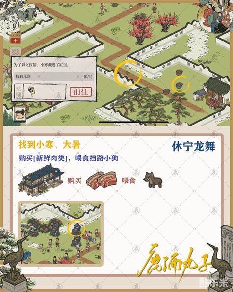 1.找到小寒、大暑,购买新鲜肉类,喂食挡路小狗,小寒、大暑位置标记在图中。
