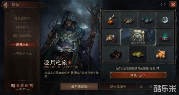 满月献礼,皎皎素魄光华普降暗黑大地;异宝奇珍,丰厚实物奖励静候玩家遴选。月华流转,待你解读,本次活动一共分为三期,第一期将于7月29日-7月31日举行,登录《暗黑破坏神:不朽》完成隐士的任务可获得弦月微光,参与神秘宝箱抽奖,即有机会获得上述实物大奖和游戏道具奖励。
