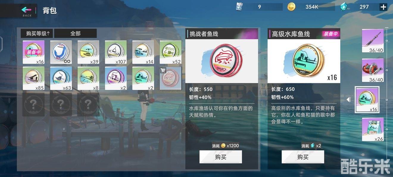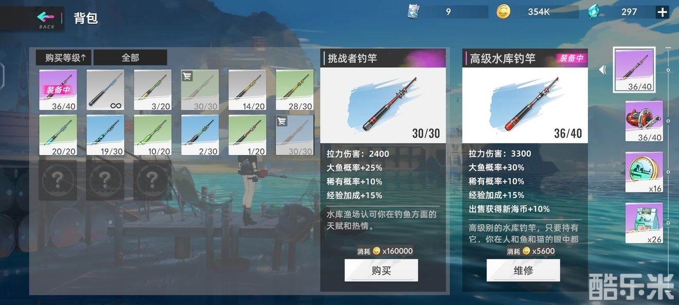 钓鱼22级解锁的新鱼竿、鱼线、线轮,好的那一套全都要猫眼石解锁(大概500左右),还是比较贵的,以下是属性对比图。如果猫眼石有富余,还是建议买的,能更省事并钓到更多紫色以上的鱼。