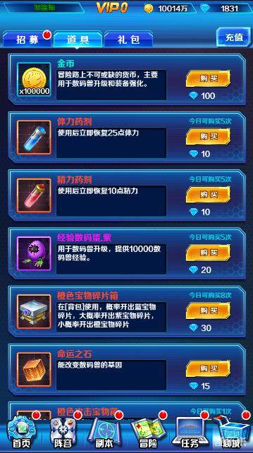 数码兽商店也会出突破宝石,金币和命运之石。如果缺的话,数码兽商店也可以买一些。特别是命运之石,钻石不足的冒险者这里一定不要错过。兽魂不足的话,可以出售掉一些不用的数码兽碎片是可以换到不少的兽魂的。