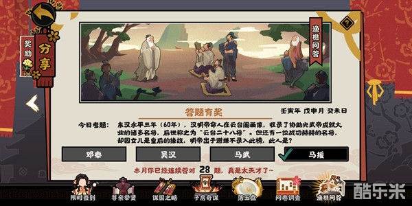 1、今日考题:东汉永平三年(60年),汉明帝命人在云台阁画像,收录了协助光武帝成就大业的诸多名将,后世称之为“云台二十八将”。但还有一些战功赫赫的名将,却因女儿是皇后的缘故,明帝出于避嫌不录入此榜,此人是?
