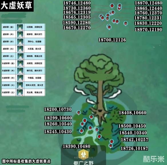 1、创造与魔法大虚妖草位置分布图如下图所示: