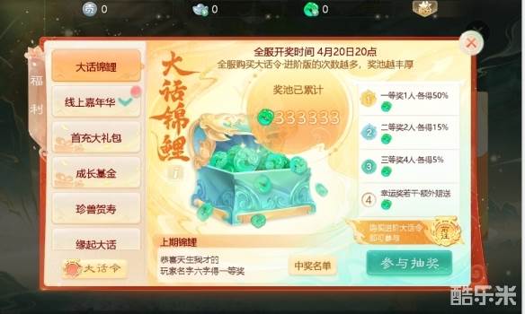 另外,“大话锦鲤”抽奖活动也将随着大话令上线同时启动,每位进阶大话令购买者都会为奖池积累一定仙玉,奖池会在本期大话令的最后一日开奖,获得一等奖的幸运儿将能直接获得奖池中仙玉的50%! 中奖人会在购买本期进阶大话令或典藏·进阶大话令的侠士中选出。全服购买大话令进阶版的次数越多,奖池越丰富,快来购买进阶大话令,一起瓜分奖池大奖吧!