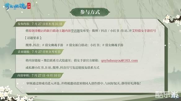7月27日-8月31日,参与者需要将原创非搬运的新白联动主题内容,带话题发布至微博/抖音/小红书/B站,同时@倩女手游官号,并将内容链接+微信联系方式投递至倩女手游官方邮箱:qnyhshouyou@163.com,或私信倩女手游官号,审核通过即为成功进入评选,并将被邀请进暑期同人创作群,与同好畅谈!京东现金卡、倩般恋你七夕礼盒、全新周边等你开启。
