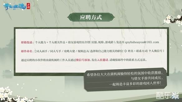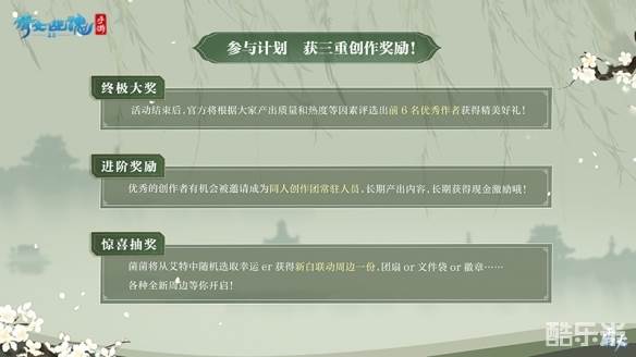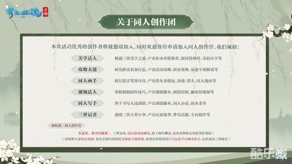 本次活动中优秀的创作者还将被邀请加入菌机阁-同人创作营!同时也诚邀美学达人、攻略大佬、同人画手、视频达人、同人写手、三界记者等各位能人才士加入创作营中。在这里你可以抢先知晓三界新鲜大事,享受全新内容优先体验的资格,优质内容还将获得百万玩家平台曝光的机会!倩女手游期望与玩家共同成长,一起铸造丰富多彩的游戏同人世界。
