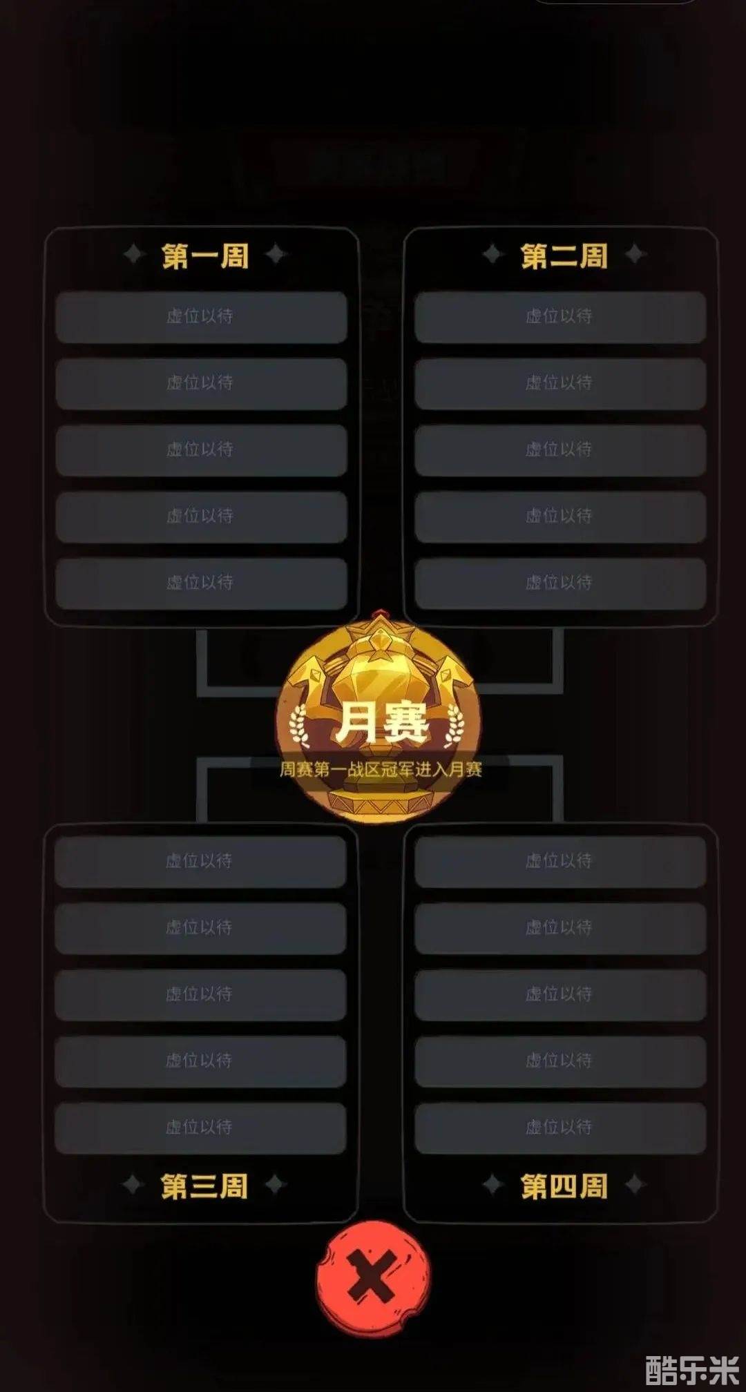 历经四场周赛,每五百服共20个晋级俱乐部进行一场争霸赛,角逐月赛冠军!月赛的参赛成员为该俱乐部晋级时的参赛成员;俱乐部晋级月赛后,新加入俱乐部的玩家无法参加月赛。