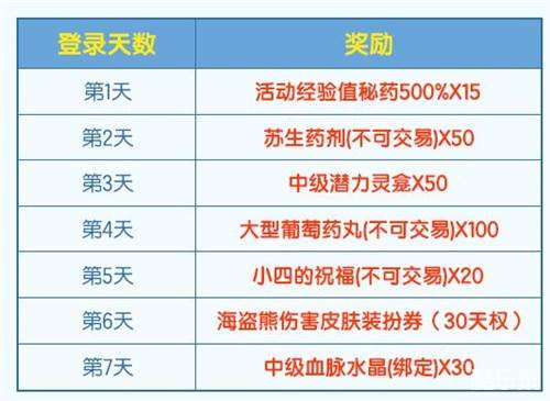 此外,还有个动动手指就能参加的活动:登录新服参与每日签到,将能领取7天登录好礼,其中包括海盗熊伤害皮肤装扮券(30天权)、中级血脉水晶(绑定)等奖励。