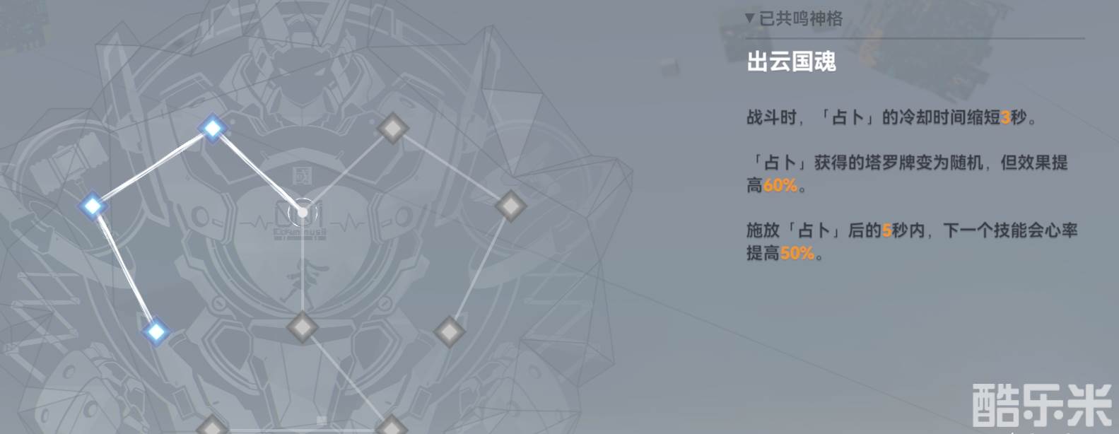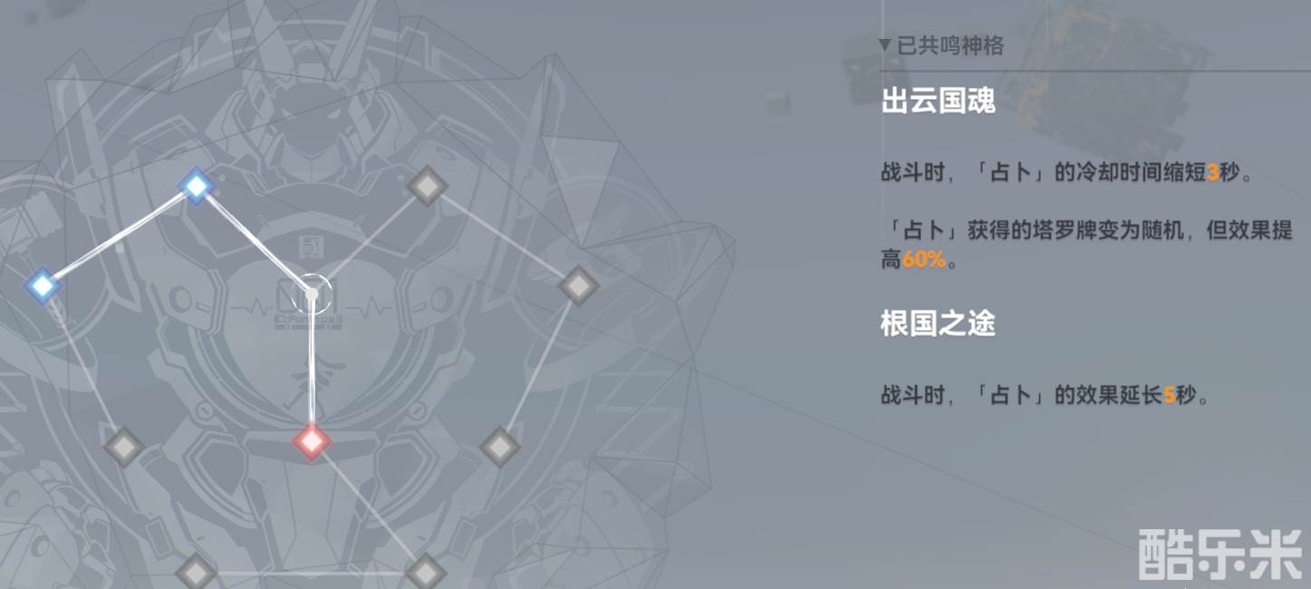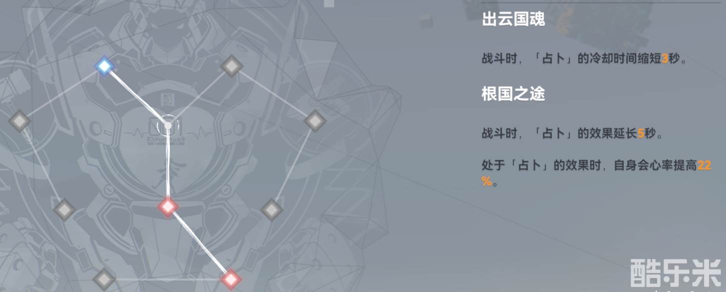 ①2点出云国魂+1点根国之途,加强了占卜,让占卜技能更加好用。