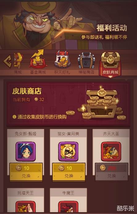 皮肤商城在菜单栏的福利里面,进去滑到最后就能看到了。