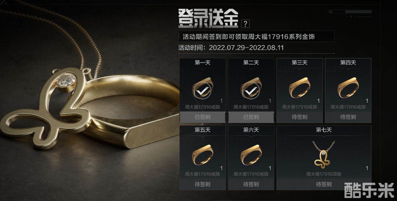 【活动规则】活动期间登录游戏,在签到活动页面签到即可领取游戏道具——周大福17916系列金戒指。累计签到七天可领取游戏道具——周大福17916金项链。