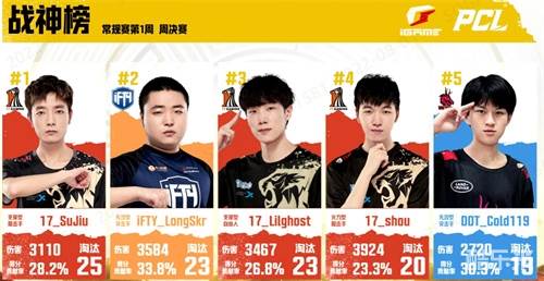 本周17战队全员表现神勇,一队竟三人上榜,其中,SuJiu选手以25个淘汰数、28.2%的得分贡献率位居战神榜第一名;Lilghost选手和shou选手则是分别以高达3467的伤害值和3924的伤害值位居战神榜第三和第四;IFTY战队的LongSkr在本周除了获得战神榜第二名之外,也成为了首位淘汰数突破1000的选手;DDT战队的Cold119选手则是以30.3%的得分贡献率、19个淘汰数位居战神榜第五名。