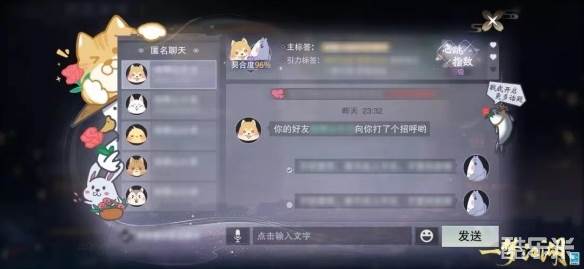 通过“西皮滴滴”或主动发起,成功开启一段浪漫又神秘的匿名聊天后,少侠便能通过语音、文字、表情、实时语音等形式与对方进行沟通。此外天机阁还在1V1专属匿名聊天界面中,配备了贴心破冰小对话,让“大树桔”帮你找话题!匿名聊天中,少侠还可以通过界面显示获知自己与对方的匹配度和心跳指数,双方的性格契合度越高匹配度就越高,而心跳指数则与少侠们的聊天频率与对话数量息息相关!
