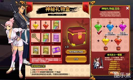 7月28日服务器维护后~8月18日7点之间,玩家购买“神秘礼物盒”打开后会获得道具。收集右方全部的神秘宝石后可以获得:夜叉武士一整套(永久特殊套装)。