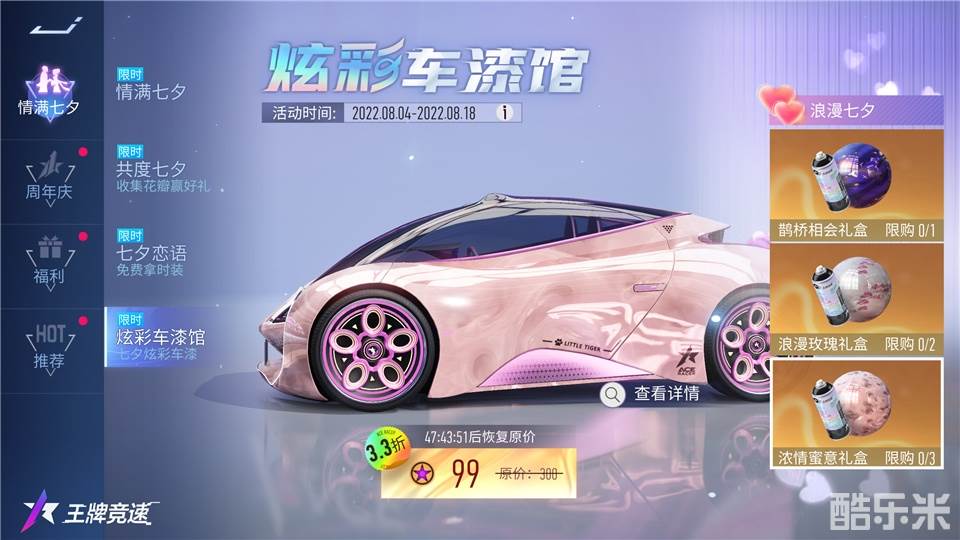如此佳节,在华丽服饰之外,浪漫豪车定然不会缺席,那些承载着竞速热情与梦想的赛车也需要好好装饰一番。在七夕活动中,车手们除了可以在鹊桥恋语和甜蜜之旅中抽取奶油小兔、草莓萌兔、贝母云雾涂装和星际信使轮毂等精美外观外,还将迎来三款限定发售的炫彩车漆——鹊桥相会、浪漫玫瑰和浓情蜜意,三款车漆将于8月4日至18日限量上架,限定时间内购买还可享诱人折扣,为你的幻想阵营车辆换上浪漫新装!
