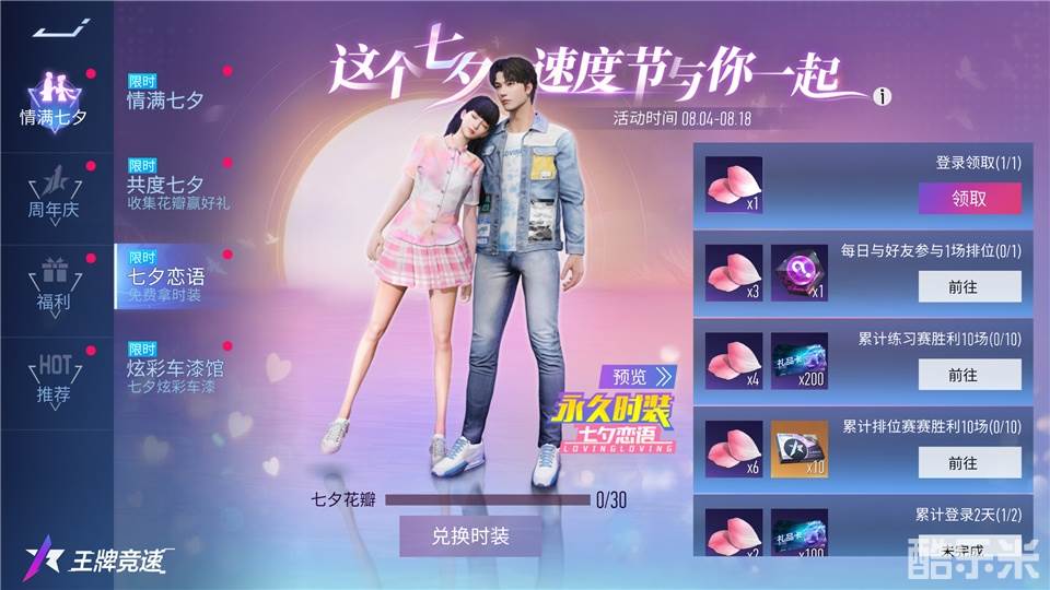 王牌速度节为车手们精心准备了七夕三重福利活动,参与即可赢取丰厚好礼,不容错过!8月4日至8日,达成点赞、为好友送礼、与好友组队参赛等简单任务,即可获得玫瑰花和海量金币,并可畅享好友对局、送礼好感度翻倍的福利,让你们的情谊迅速加深。8月4日至18日,每日随机拾取各色花瓣,用花瓣点亮拼图,连接成线后将解锁奖励,点亮全部9个花瓣还可额外获得一份“神秘好礼”;完成练习赛累胜、排位赛累胜、累计登录等任务,获取七夕花瓣与各类好礼,集满30枚七夕花瓣,就可以兑换永久时装“七夕恋语”,让清新甜美的青春爱情满溢速度节!