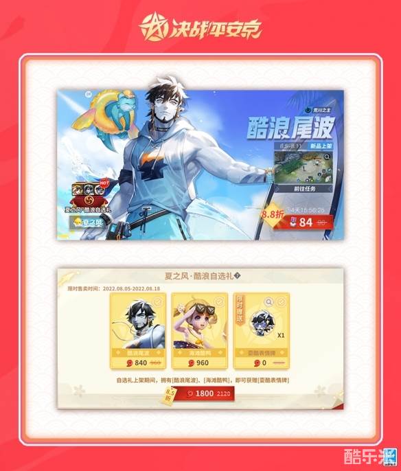 8月5日维护后-8月18日,【夏之风·酷浪自选礼】将上架杂货铺。 上架期间,拥有荒川之主「酷浪尾波」、金鱼姬「海滩酷鸭」,即可获赠【耍酷表情牌】。