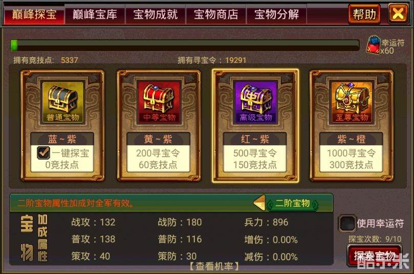 ·巅峰探宝时,每一种探宝选项都有机率获得二阶宝物。
