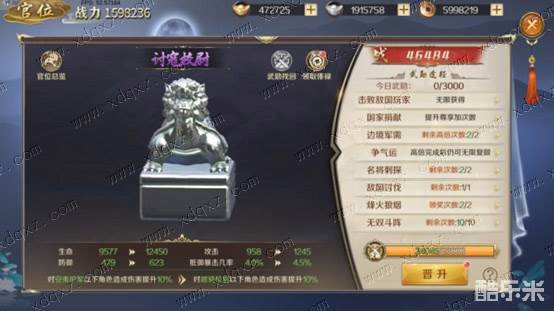 官位系统是里面提升战力最多的,但要求也比较高,提升官位需要获得相应的功勋,功勋可以完成一些日常任务获得,也可以使用元宝找回。功勋和能否晋升官位是直接联系的,官位可以领取的俸禄也会越多